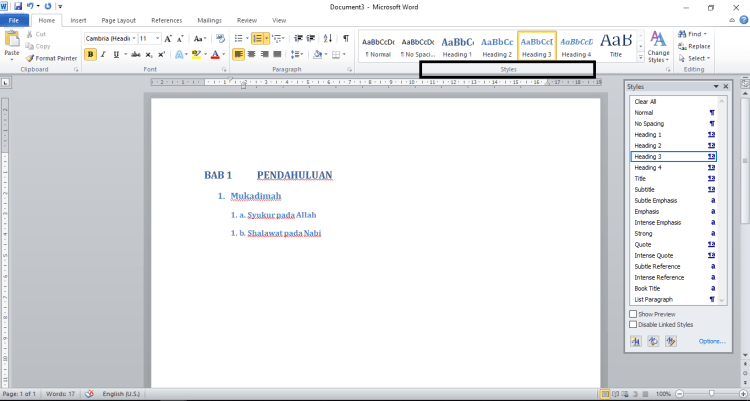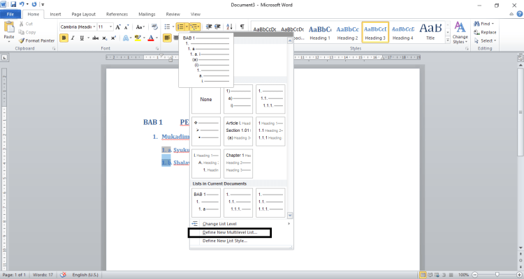 Bab dan SubBab dapat dibuat menggunakan fitur Style pada menu Home. Setelah itu lakukan pengaturan pada menu Paragraph di bagian Define New Multilevel List.