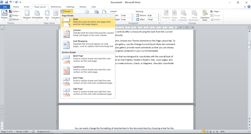 - Page Break adalah pemisah yang masih mempertahankan format agar sama dengan halaman sebelumnya. Terbagi tiga yaitu Page (memisahkan halaman pertama dengan halaman berikutnya), Column (memisahkan bagian kolom pada halaman yang sama atau bukan), dan Text Wrapping (memisahkan text di sekitas gambar).
