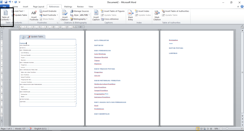Pertama-tama buat kerangka untuk daftar isinya, kemudian tentukan Style Heading. Berikutnya klik Table of Contents pada menu References.