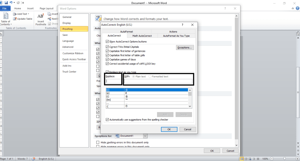 Fitur ini mempermudah kerja apabila terjadi Typo pada kata yang sering salah sehingga tidak perlu mengetik ulang. Klik File pada kiri atas lalu Options > Proofing > AutoCorrect Options, sampai muncul jendela seperti pada gambar. Input kata yang sering Typo pada bagian Replace dan kata yang benarnya pada bagian With.