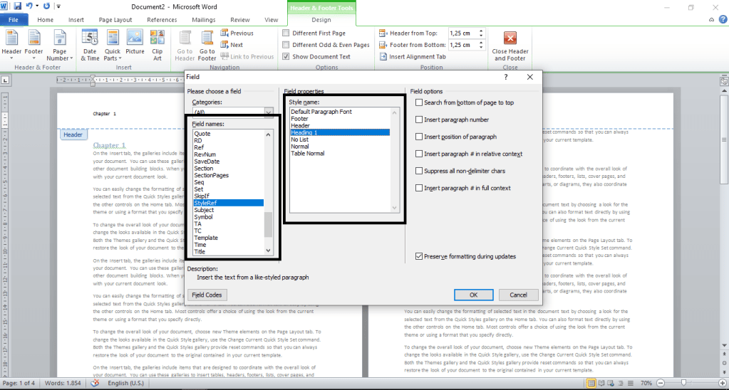 Fitur digunakan untuk membuat header yang berkelanjutan sesuai bagian yang stylenya berbeda. untuk menggunakan fitur ini pertama-tama berikan efek Heading 1 pada kata atau kalimat yang ingin dijadikan isi header. Kemudian double klik pada bagian atas kertas kerja untuk memunculkan menu Design Header&Footer > Quick Parts > Field. Setelah itu akan muncul seperti pada gambar, pilih StyleRef pada bagian Field Names, lalu Heading 1 pada bagian Style Name, terakhir klik ok.