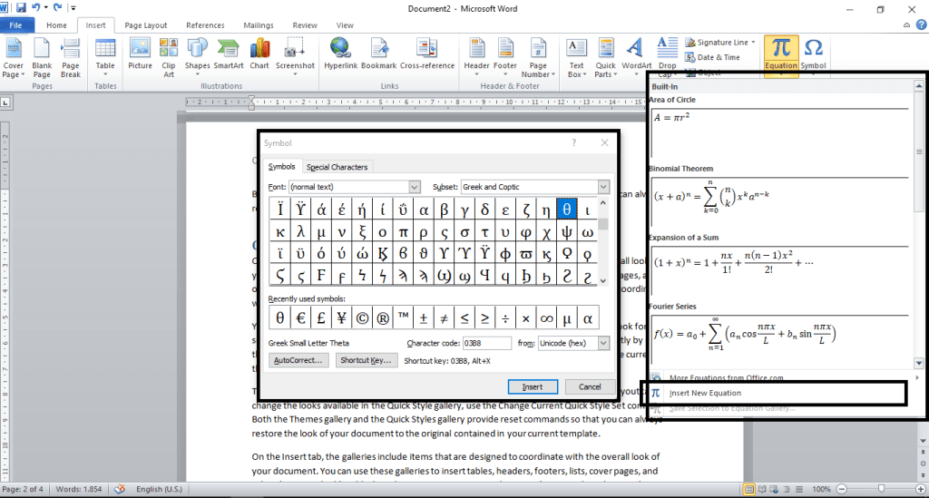 Microsoft Word menyediakan formula yang dapat dipilih pada tab Equation menu Insert. Selain itu temen-temen juga dapat membuat formula sendiri menggunakan Symbol yang tersedia dengan mengklik Insert New Equation.