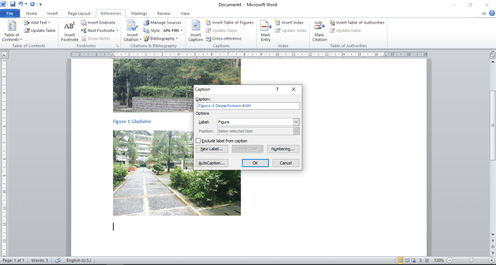 Fitur ini memudahkan dalam membuat judul gambar atau tabel yang banyak dan berkelanjutan sehingga temen-temen tidak perlu menghitung atau mengurutkan manual. Klik Insert Caption pada menu References.