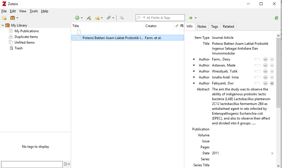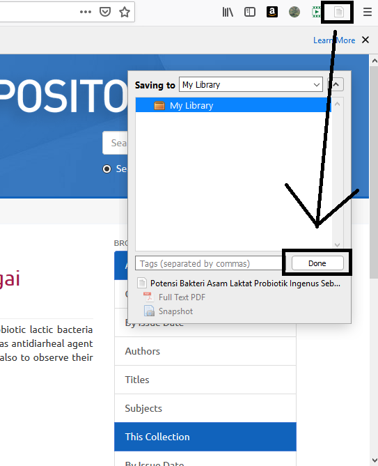 Unduh jurnal yang akan temen-temen gunakan (gua ngambil dari IPB Repository) dengan cara membuka jurnalnya dan klik icon Zotero pada pojok kanan atas lalu done. Jurnal akan otomatis tersimpan pada perangkat temen-temen.