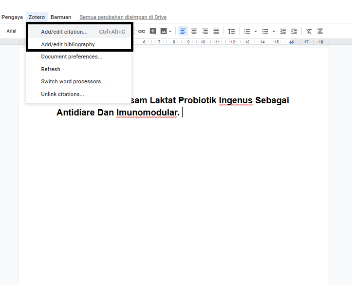 Buka Google Docs yang akan dimasukan sitasi dan daftar pustaka, kemudian klik Add/edit Citation untuk membuat sitasi atau Add/edit Bibliograpy untuk membuat daftar pustaka. Pilih jurnal yang digunakan sehingga muncul sitasi atau daftar pustaka yang sesuai dengan jurnal yang temen-temen pilih.