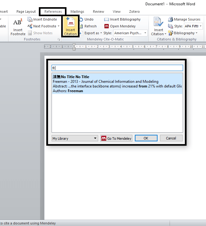 Buka file Microsoft Word yang akan ditambahkan sitasi dan daftar pustaka. Klik Insert Citation atau Insert Bibliography. Lalu pilih jurnal yang telah diunduh dengan mengetikan kata kunci pada jendela yang muncul. Terakhir klik oke, maka sitasi atau daftar pustaka akan muncul pada halaman kerja.