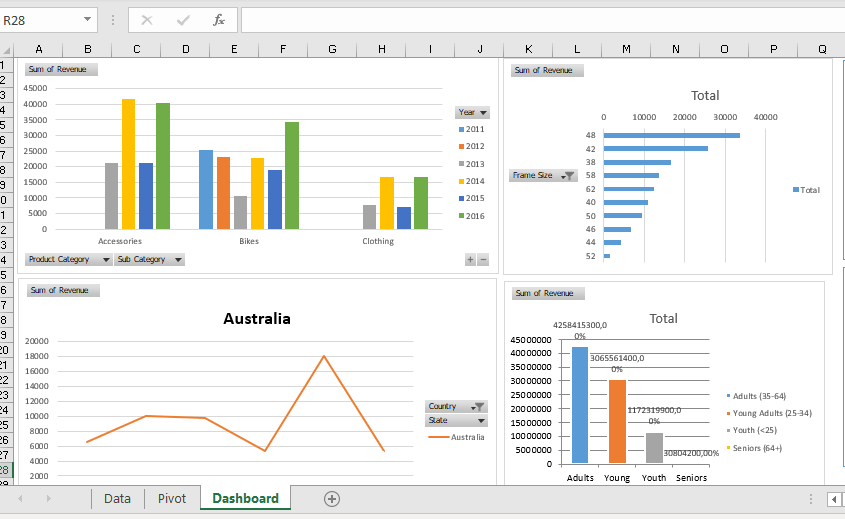 Terakhir ubah menjadi diagram Kolom. Pastikan bahwa grafik terhubung ke semua slicer dan sesuikan urutan Age Group.