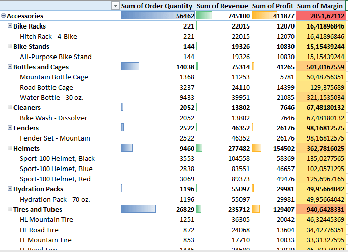Tambahkan Sub Kategori ke baris tabel pivot. Terapkan format Data bars ke kolom Order Quantity, Revenue dan Profit pada Sub Category. Gunakan warna biru, hijau, dan kuning.