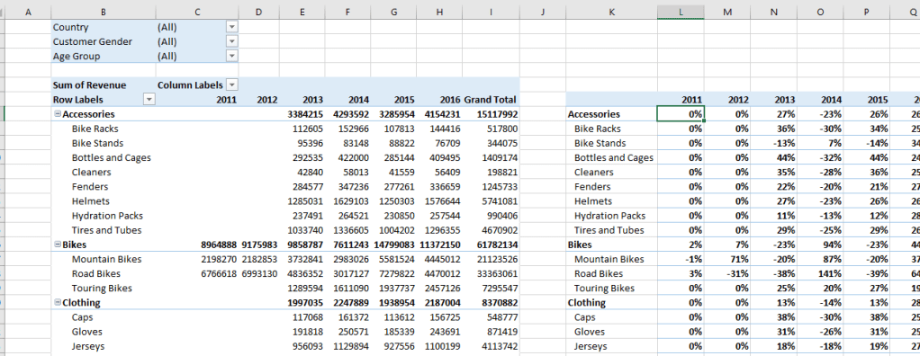 Tambahkan tabel pivot baru menggunakan SalesTable sebagai sumber dari Country, Customer Gender, dan Age Group sebagai Filters, Product Category dan Sub Category sebagai Rows, Year sebagai Columns, dan Sum of Revenue sebagai Values.