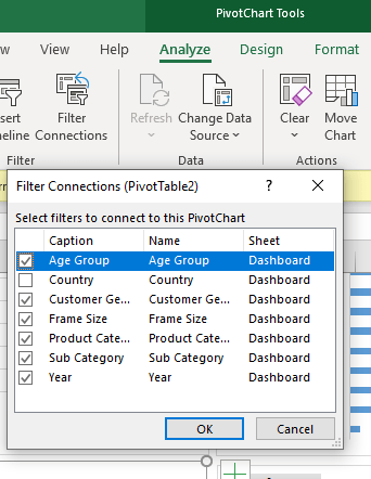 Slicers digunakan untuk mengambil beberapa bagian yang dibutuhkan dari tabel yang dimiliki. Hal yang penting dilakukan adalah menghubungkan grafik dengan slicer yang diperlukan. Caranya dengan mencentang pada Tab Filter Connections pada menu Analyze.
